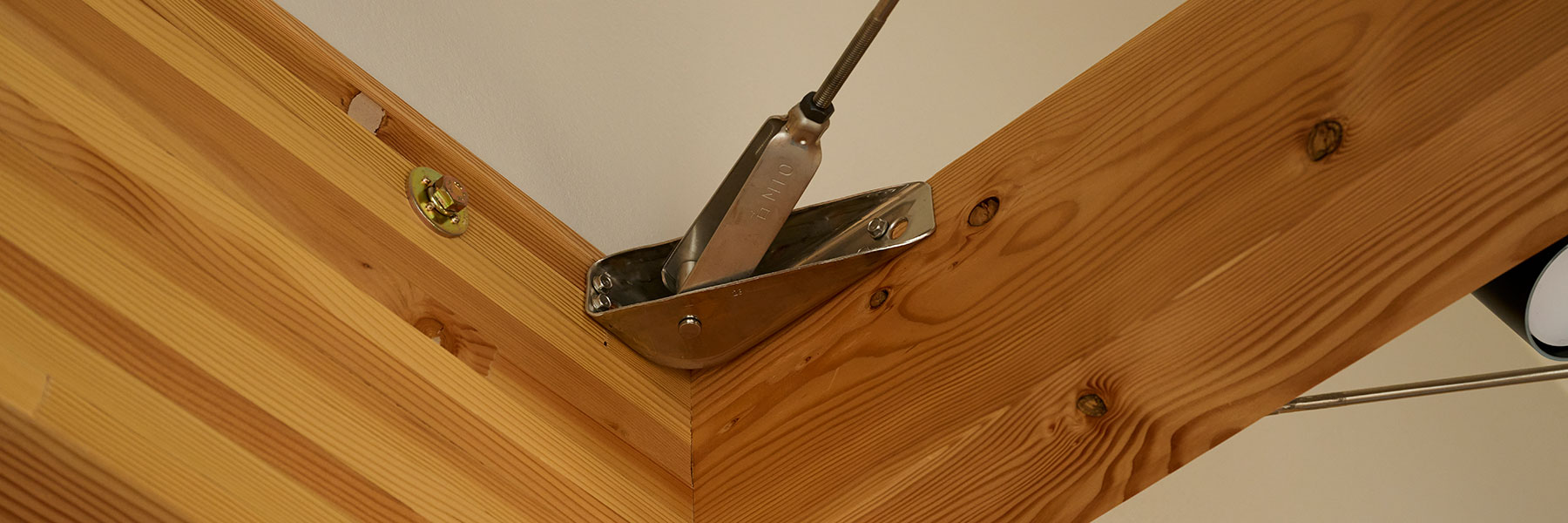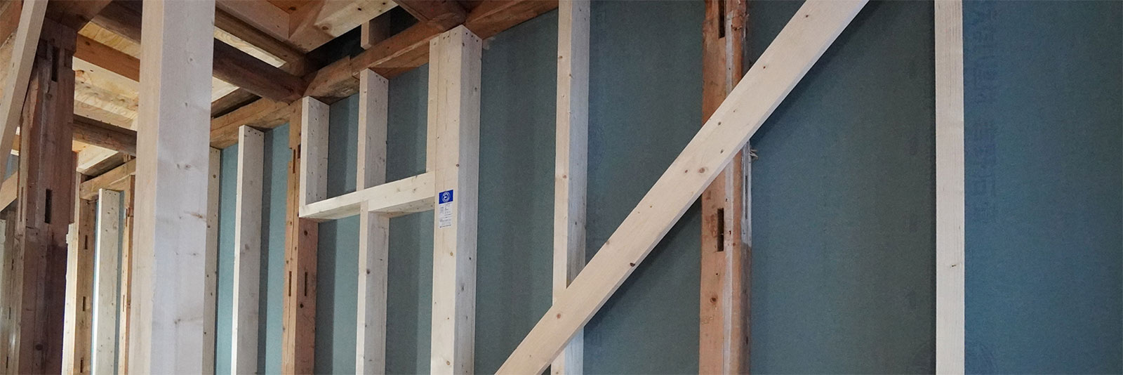 多くの方が想像する耐震補強です。柱梁の荷重を検討する事で、適切な柱や耐力壁の設置、金物での補強を行う事で、家の強度を上げる方法です。